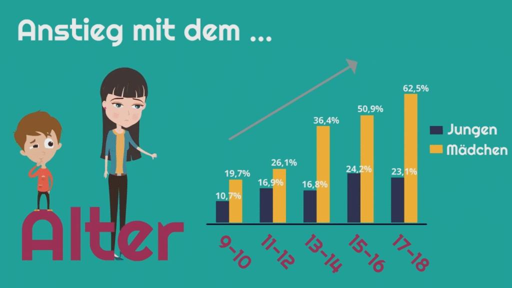 Balkendiagramm zeigt den Anstieg von Schmerzen bei Kindern und Jugendlichen nach Alter und Geschlecht; Mädchen sind häufiger betroffen als Jungen.